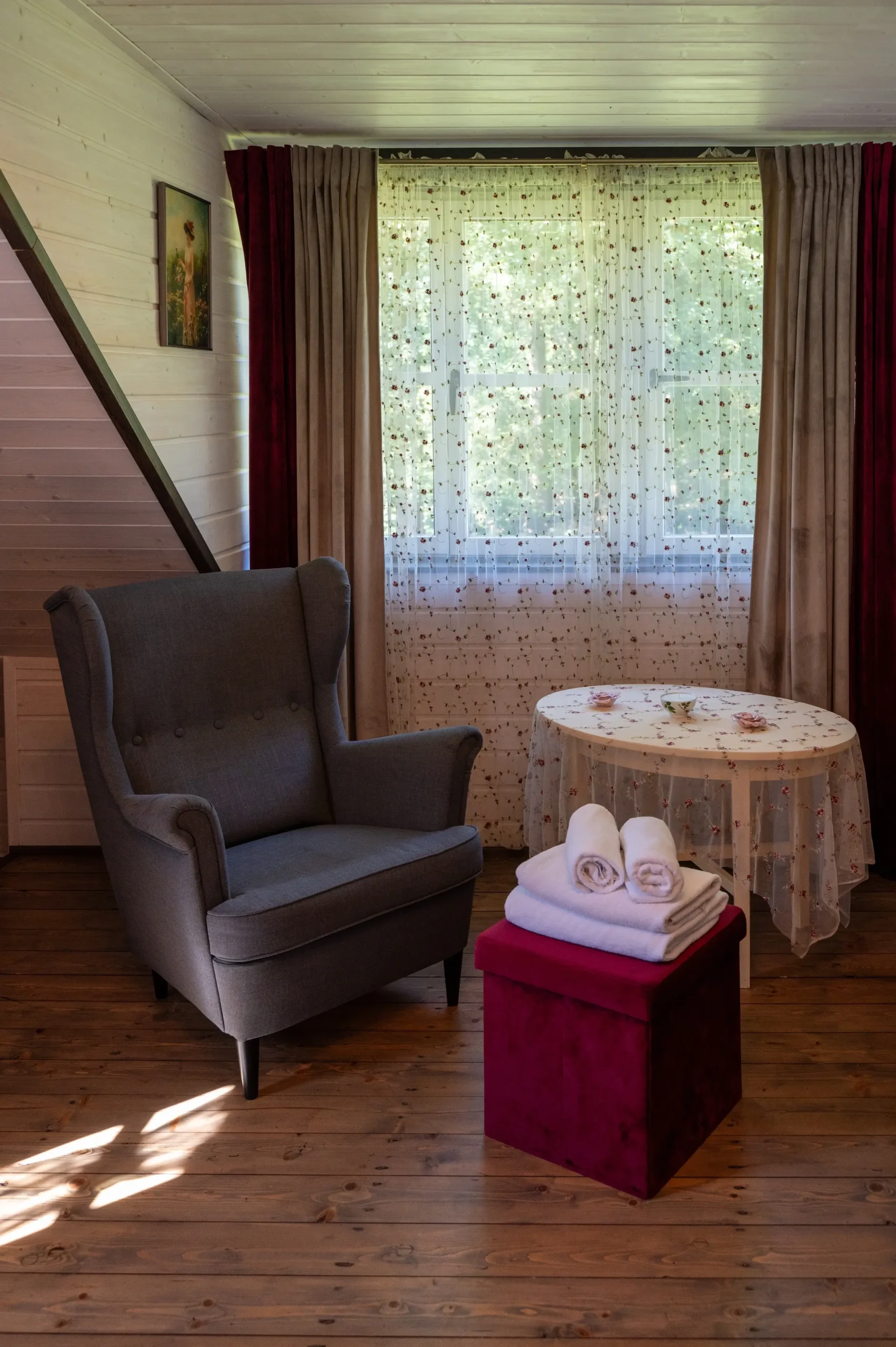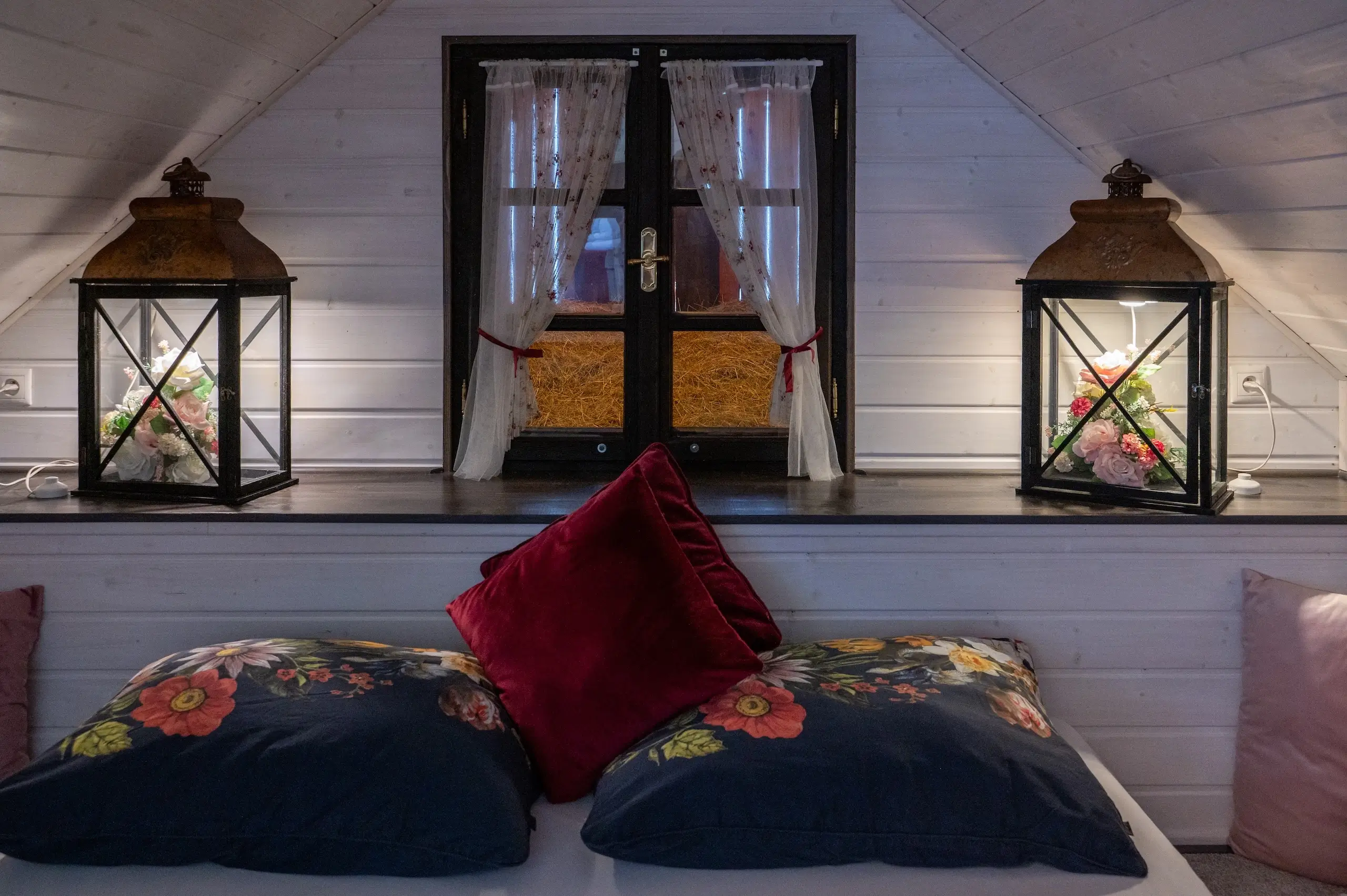 Tento jedinečný podkrovní pokoj se pyšní vlastním vchodem přes venkovní schody. Je zařízen ve stylu vintage, což mu dodává nezaměnitelnou atmosféru. Z okna za postelí je skutečný výhled na seník, a vstup do pokoje je navíc zcela oddělen od mlýnského dvora, což zaručuje klid a soukromí.